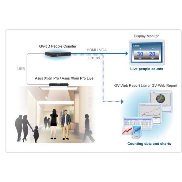 The GV-3D People Counter integrates Asus Xtion Pro / Asus Xtion Pro Live to count and analyze the number of people passing by the designated detection area. You can connect the GV-3D People Counter with a VGA or HDMI monitor for direct display of counting data and configuring device settings through on-screen display (OSD) menu. GV-3D People Counter comes with a built-in Web interface, the GV-Web Report Lite, for easy setup and looking up people counting data.